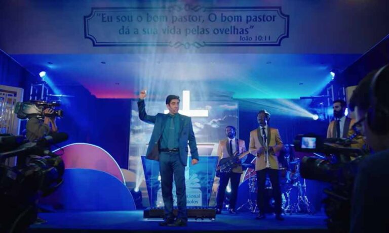 Con el apoyo de a actriz Letícia Lima, el comediante utiliza el ambiente para burlarse de los evangélicos, reforzando los estereotipos negativos.