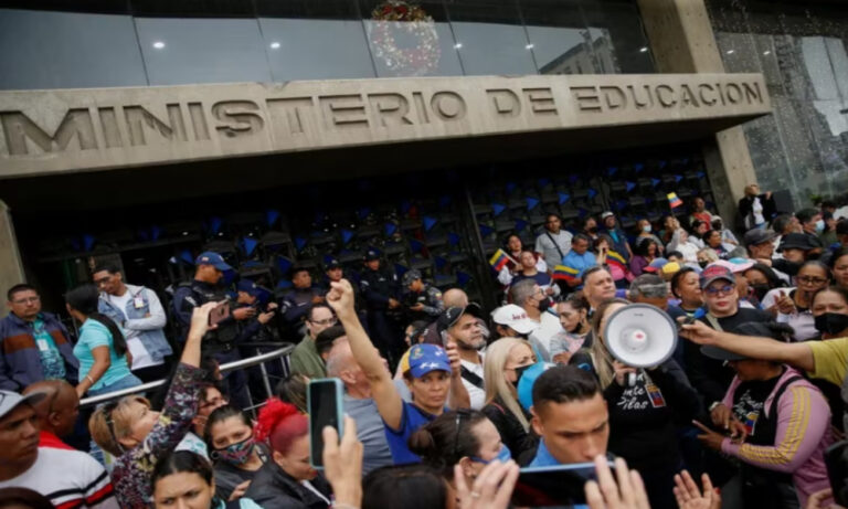 En la capital de Caracas, decenas de maestros, con pancartas en mano y cantando consignas, acudieron a la sede, del Ministerio de Educación.