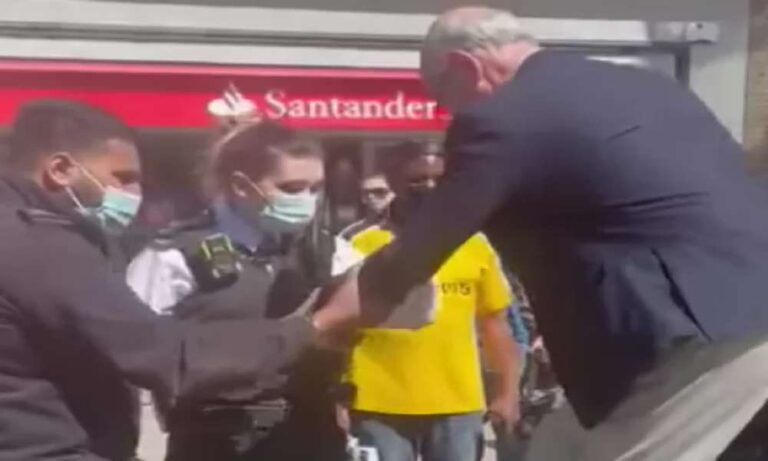 Un video compartido en línea muestra al predicador protestando contra dos policías antes de ser esposado y retirado de una plataforma elevada.